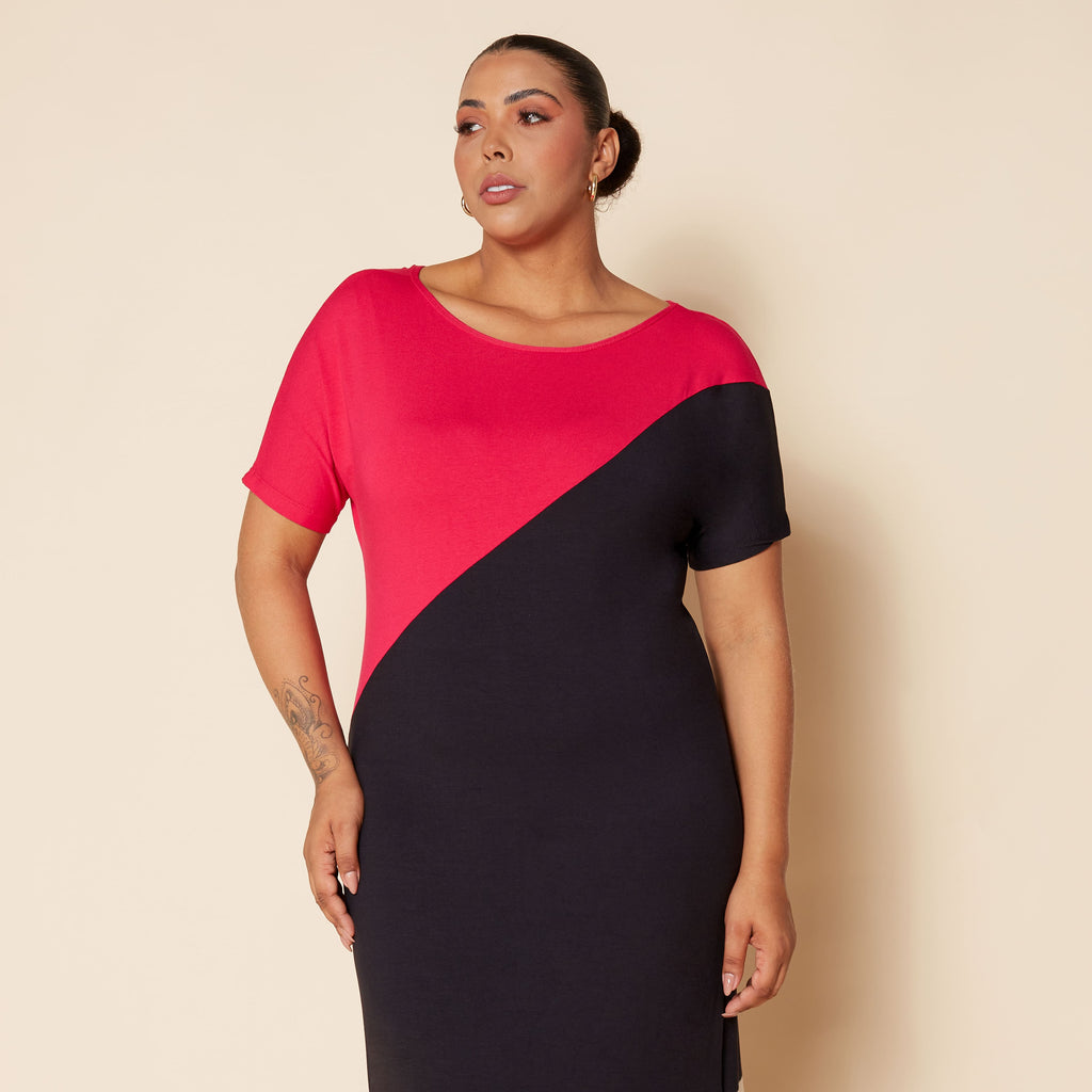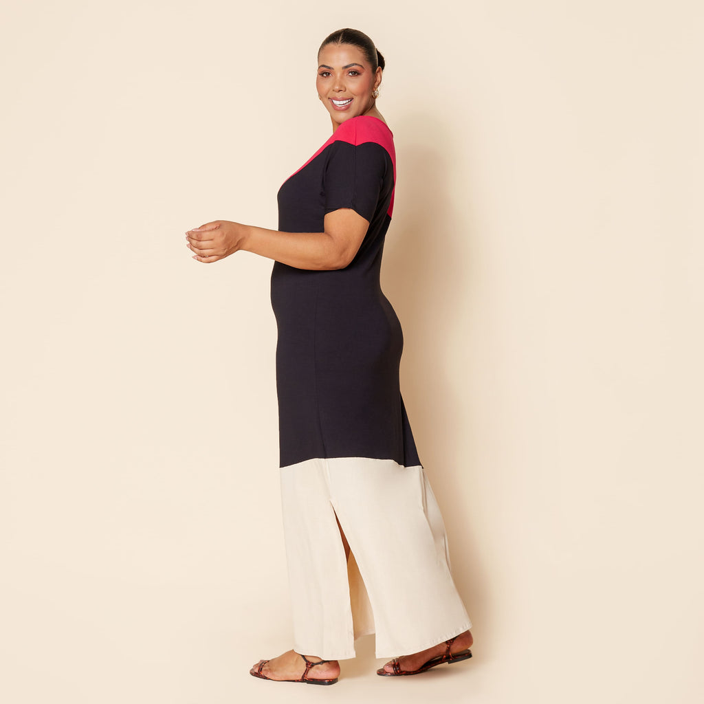 Invista em estilo e conforto com o vestido longo plus size em blocos de cor, uma peça moderna, minimalista e versátil para todas as ocasiões. Com modelagem reta e caimento soltinho, ele veste mulheres do 44 ao 54 com leveza e elegância. A combinação de pink, preto e off-white em linhas diagonais cria um visual contemporâneo e alongador, perfeito para o dia a dia ou para produções mais elaboradas com acessórios. Um vestido feminino plus size essencial no guarda-roupa de quem ama praticidade sem abrir mão do estilo.