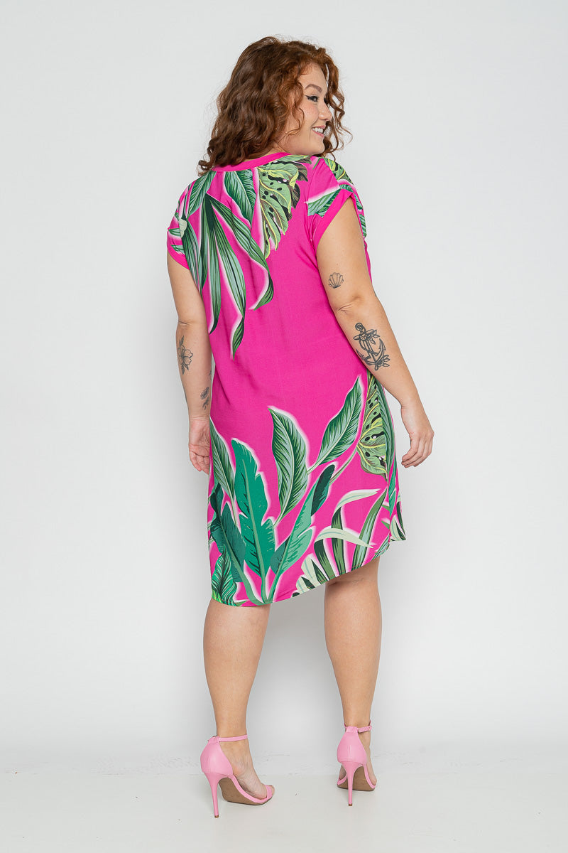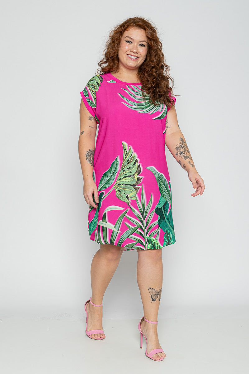 Ilumine seu visual com o vestido curto plus size pink com estampa tropical, uma peça vibrante, confortável e cheia de personalidade. Com modelagem reta e soltinha, ele veste perfeitamente mulheres do 44 ao 54, oferecendo caimento leve e muita liberdade de movimento. A estampa de folhagens em verde intenso contrasta com o fundo pink, criando um look moderno, alegre e ideal para os dias de calor. Um vestido feminino plus size perfeito para ocasiões casuais, férias, eventos ao ar livre ou passeios com estilo.