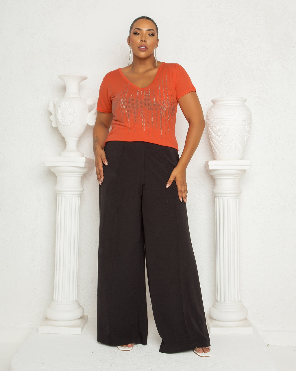 Confeccionada em viscose com elastano, a blusa oferece toque macio, ótimo caimento e liberdade de movimento. O equilíbrio perfeito entre elegância e praticidade. Versátil, ela transita facilmente do look casual chic ao visual de noite ou festas. Disponível em tamanhos do 44 ao 54, na cor laranja queimado, com modelagem desenvolvida especialmente para o público plus size.