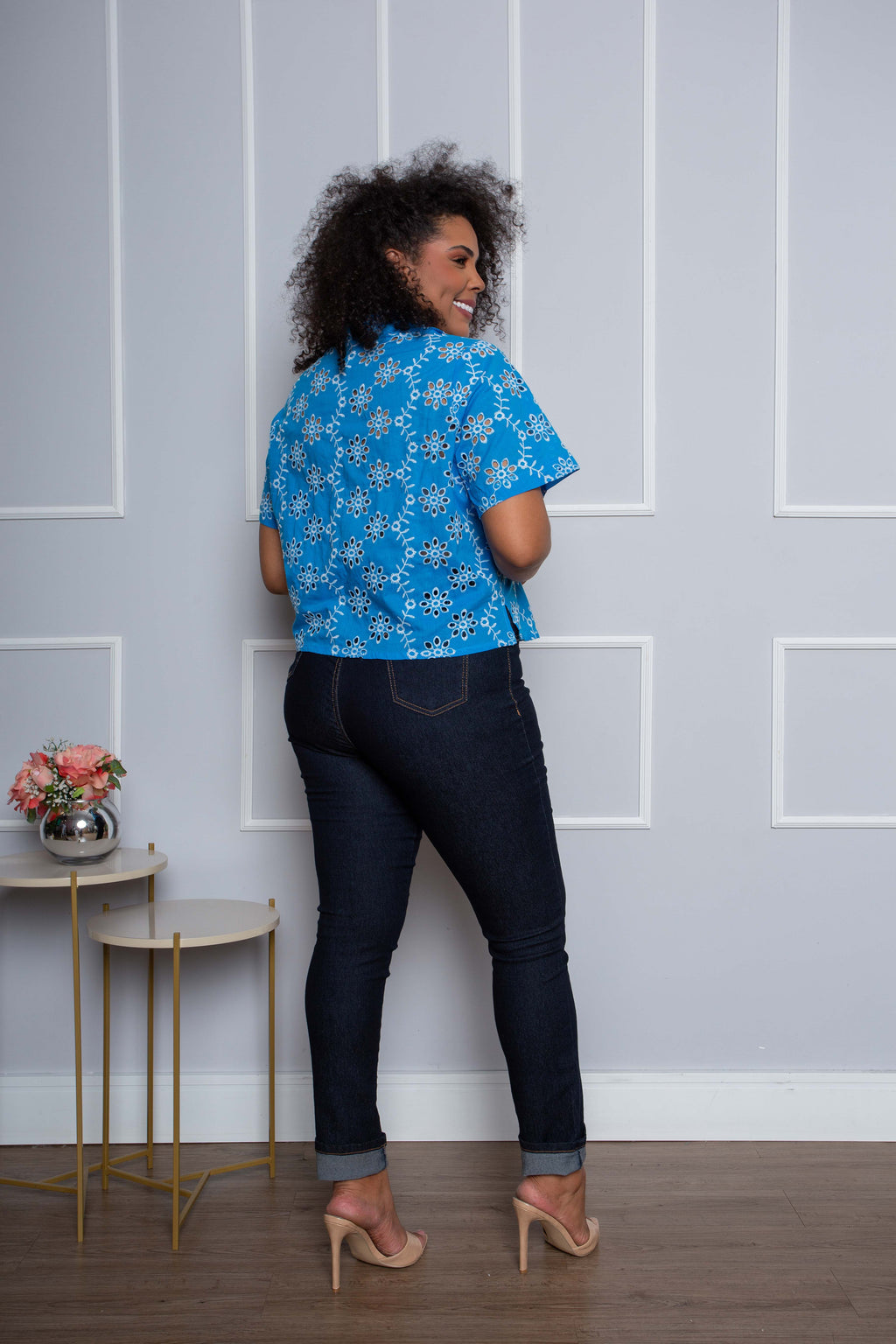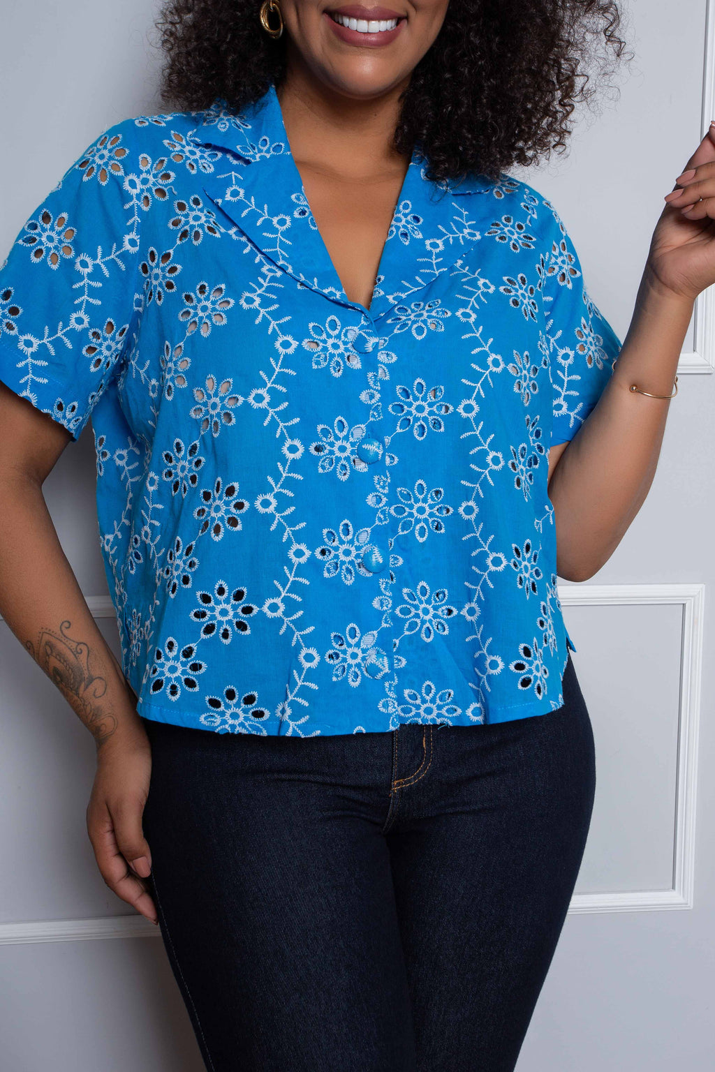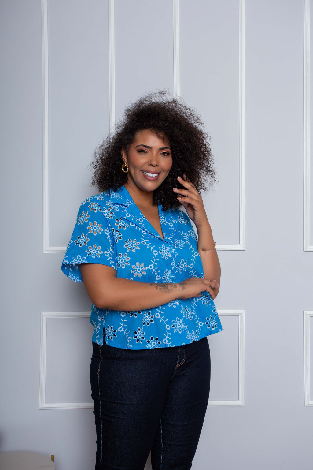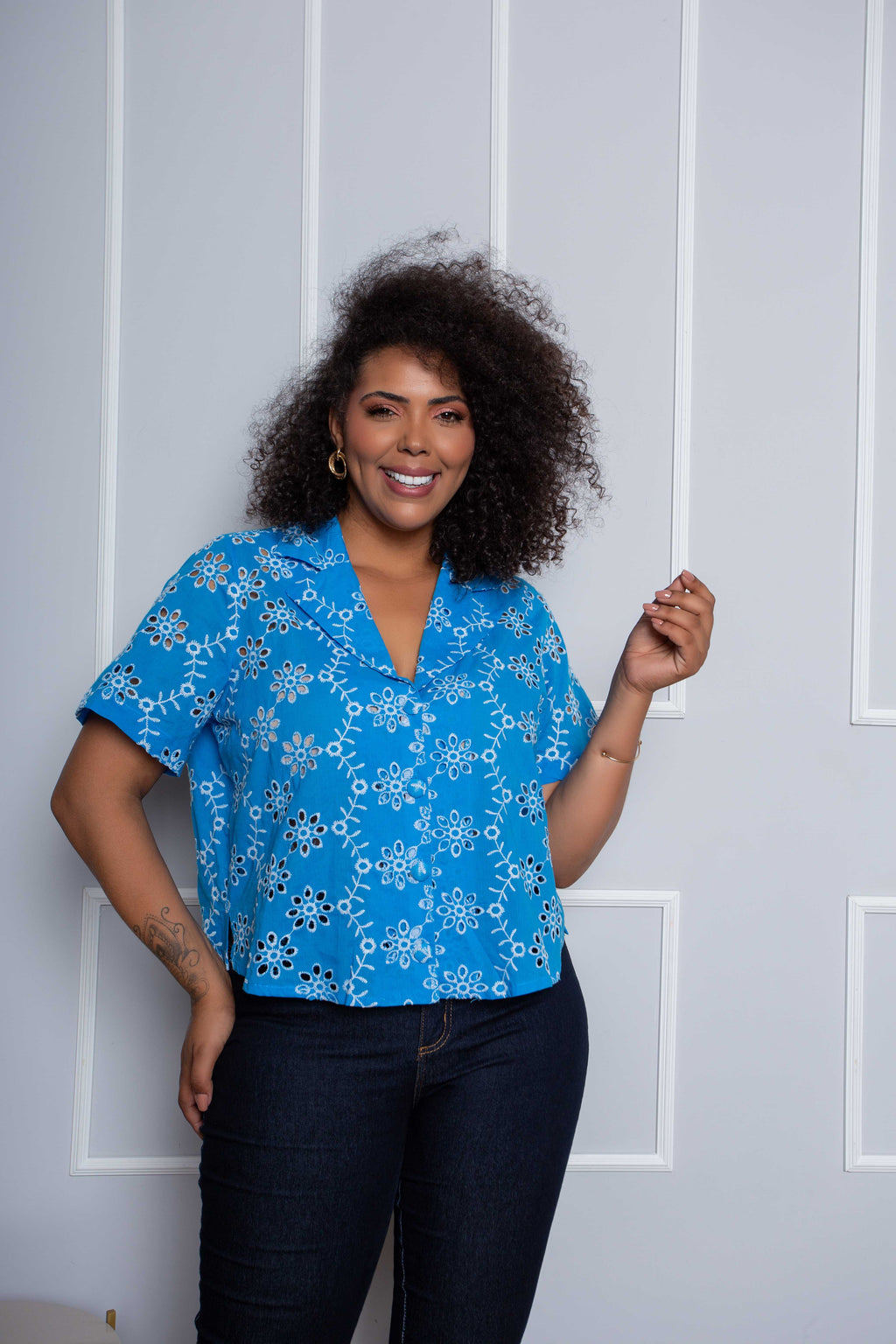 Refrescante, feminina e cheia de charme, essa camisa cropped plus size azul com bordado floral é perfeita para compor looks leves com muita personalidade. A modelagem curtinha valoriza a silhueta sem marcar, oferecendo conforto e estilo para mulheres que vestem do 44 ao 54. O bordado delicado em formato de flores brancas traz um toque artesanal à peça, ideal para composições casuais com jeans, saias ou shorts. Um item indispensável para quem ama praticidade com estilo nos dias quentes.