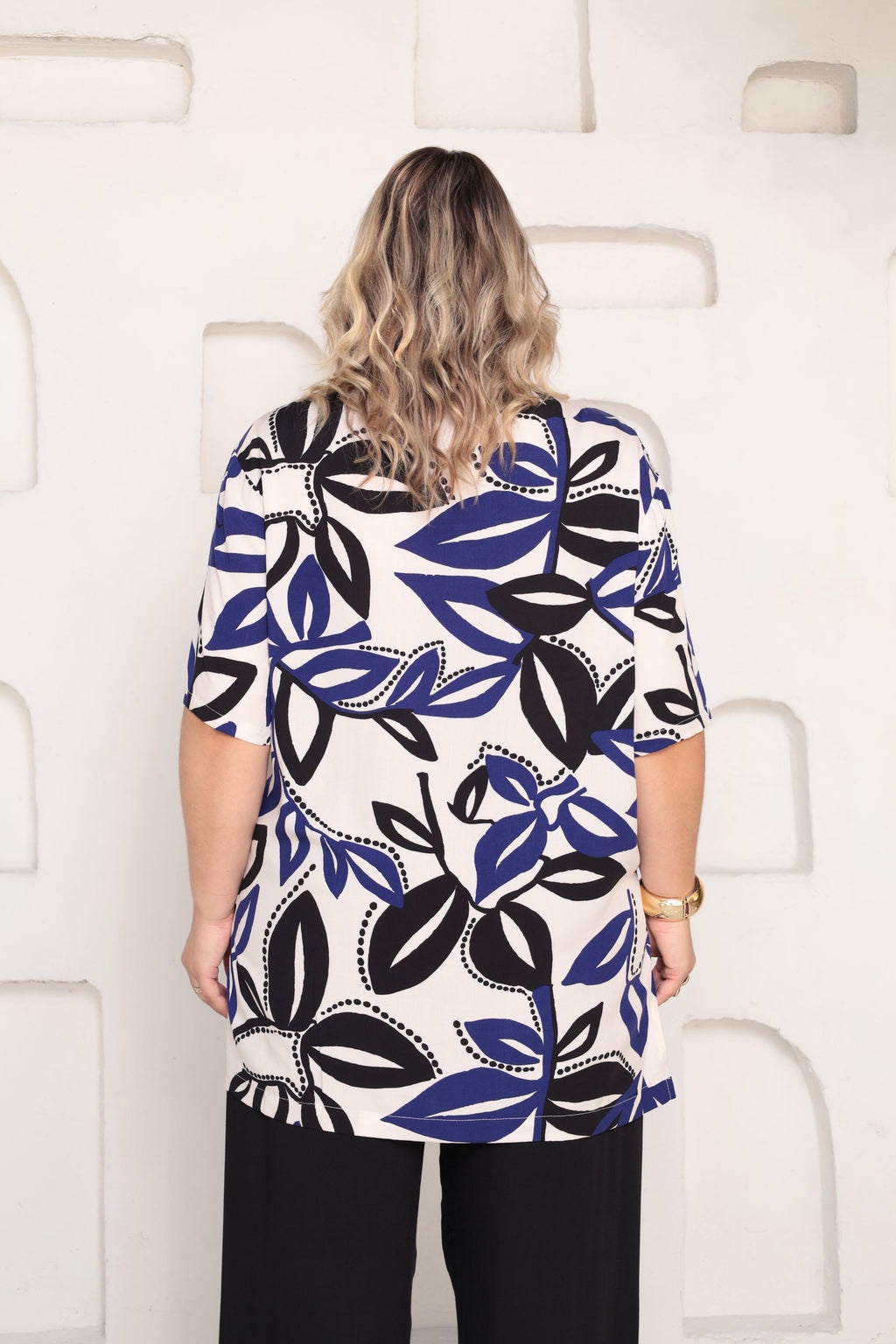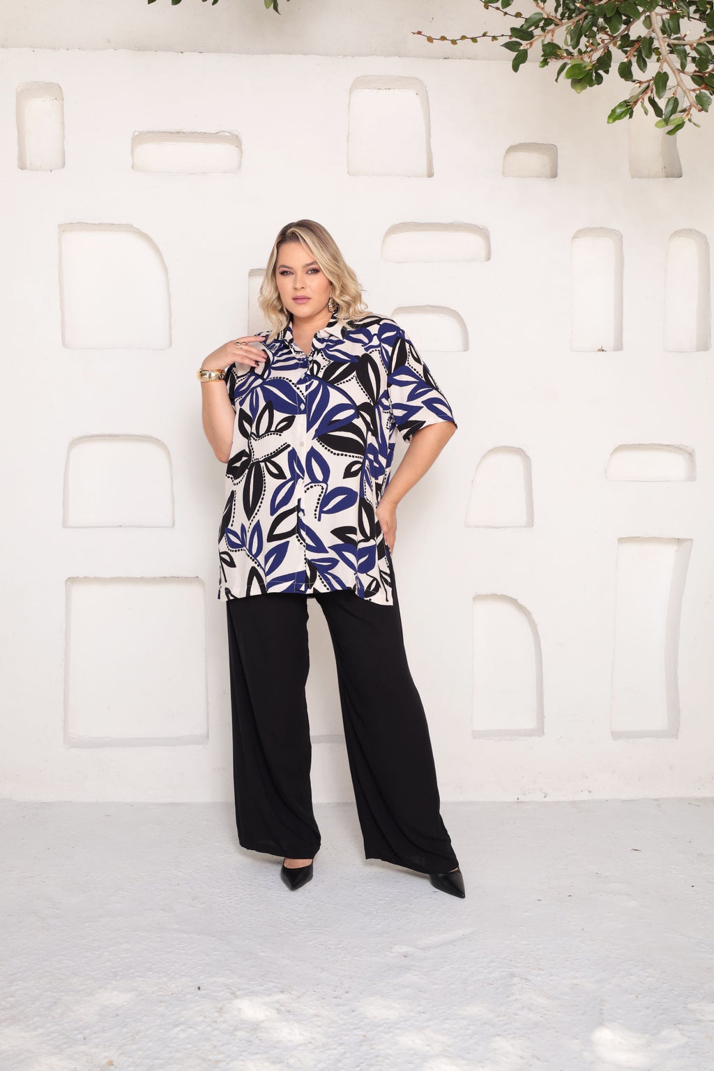 Adicione personalidade e sofisticação ao seu guarda-roupa com essa camisa plus size estampada em tons de azul, preto e off-white. A peça é ideal para mulheres que vestem do 44 ao 54 e buscam elegância com conforto. Com modelagem ampla e caimento leve, valoriza as curvas sem marcar, sendo perfeita para compor looks casuais, criativos ou até mais formais com alfaiataria. A estampa marcante de folhagens traz modernidade na medida certa, tornando essa camisa uma opção versátil e estilosa para todas as ocasiões.