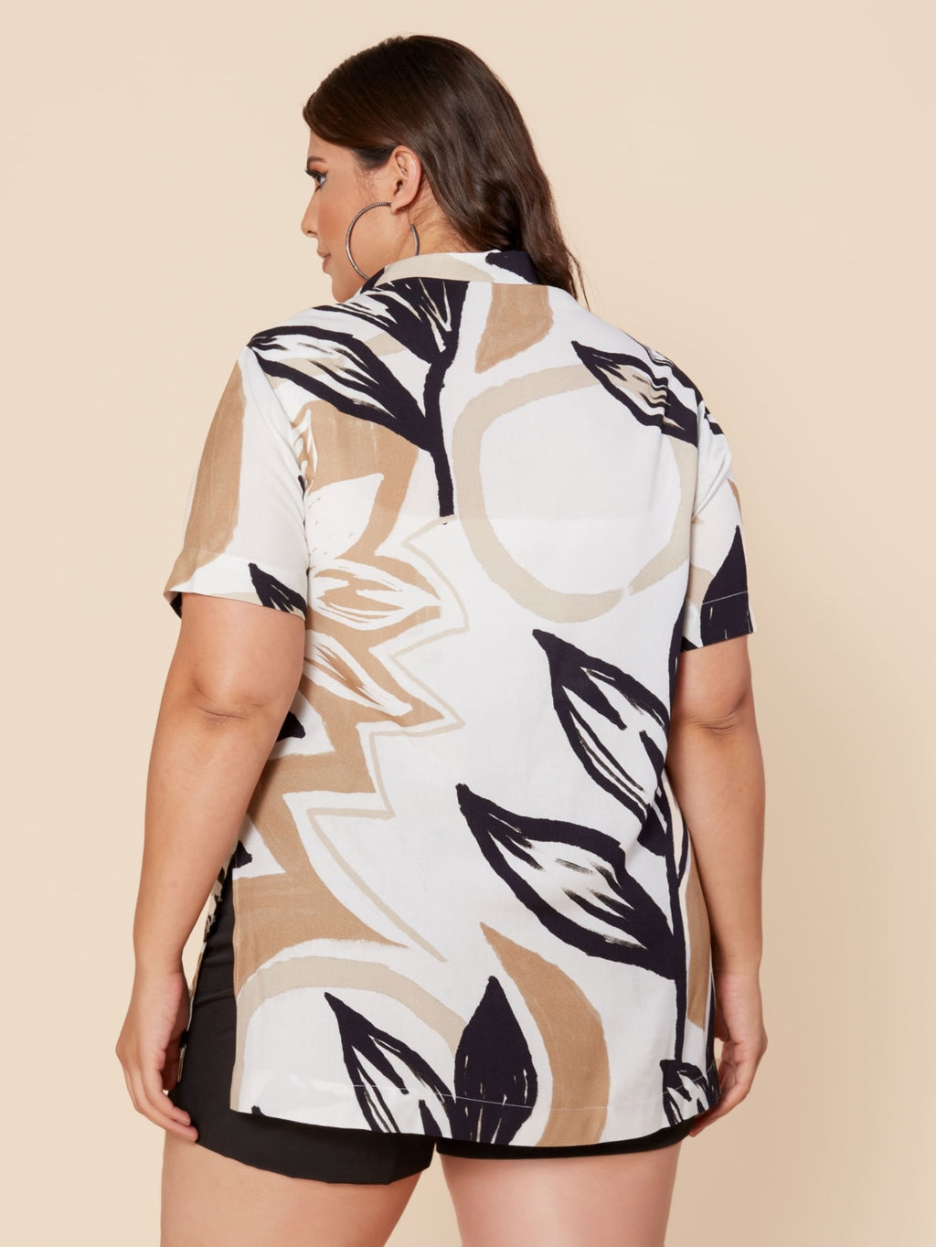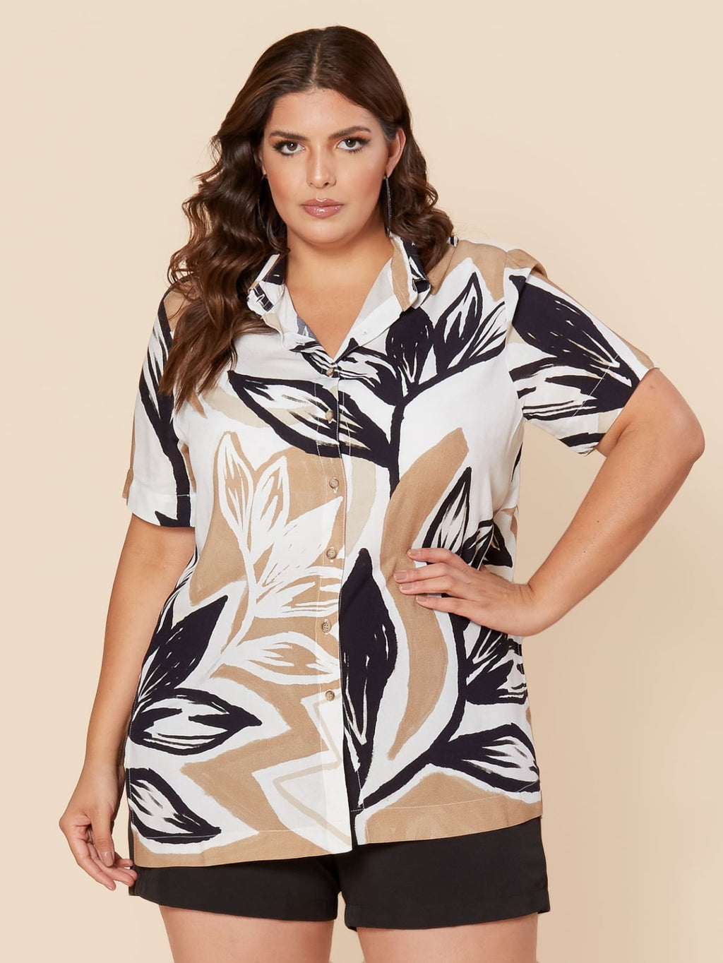 Camisa do Mais na Moda plus , feita para corpos Plus Size e Midsize inspirada em elementos sofisticados de manga curta é feita no tecido de 100% viscose, com estampa de folhas em cores neutras, fechamento frontal com botões diferenciados, fenda lateral que permite amarração para montar um look descontraído. Modelagem ampla com caimento perfeito e fluído, uma peça que compõe vários looks elegantes, amor à primeira vista.