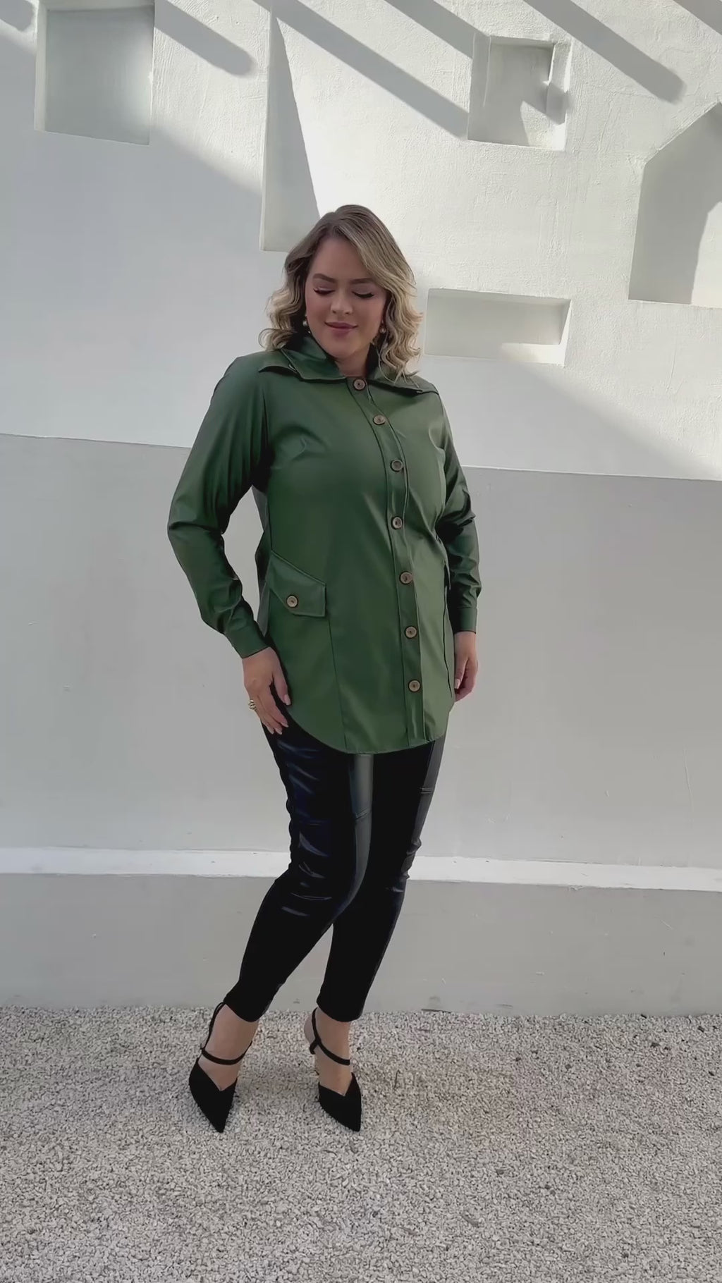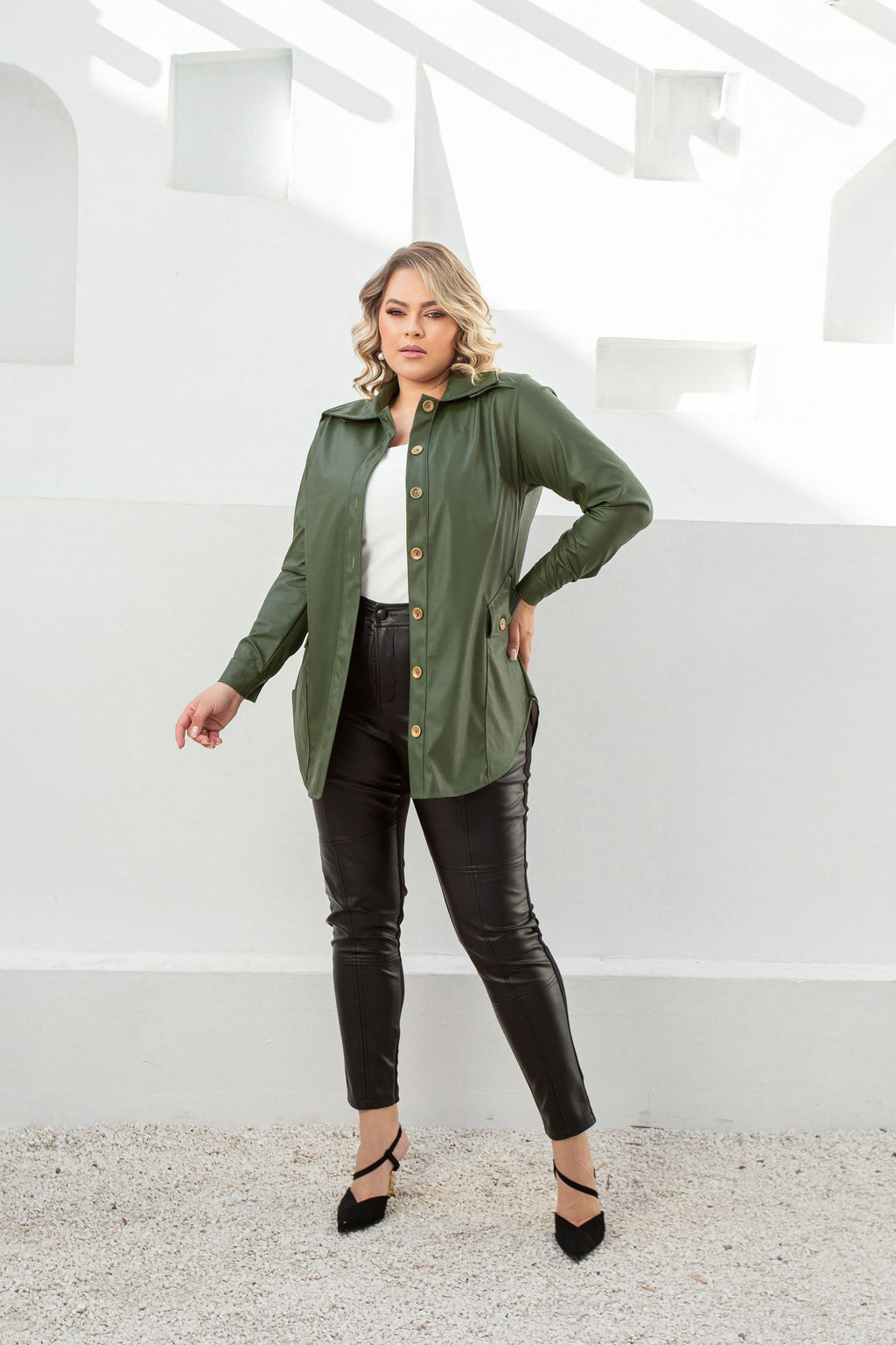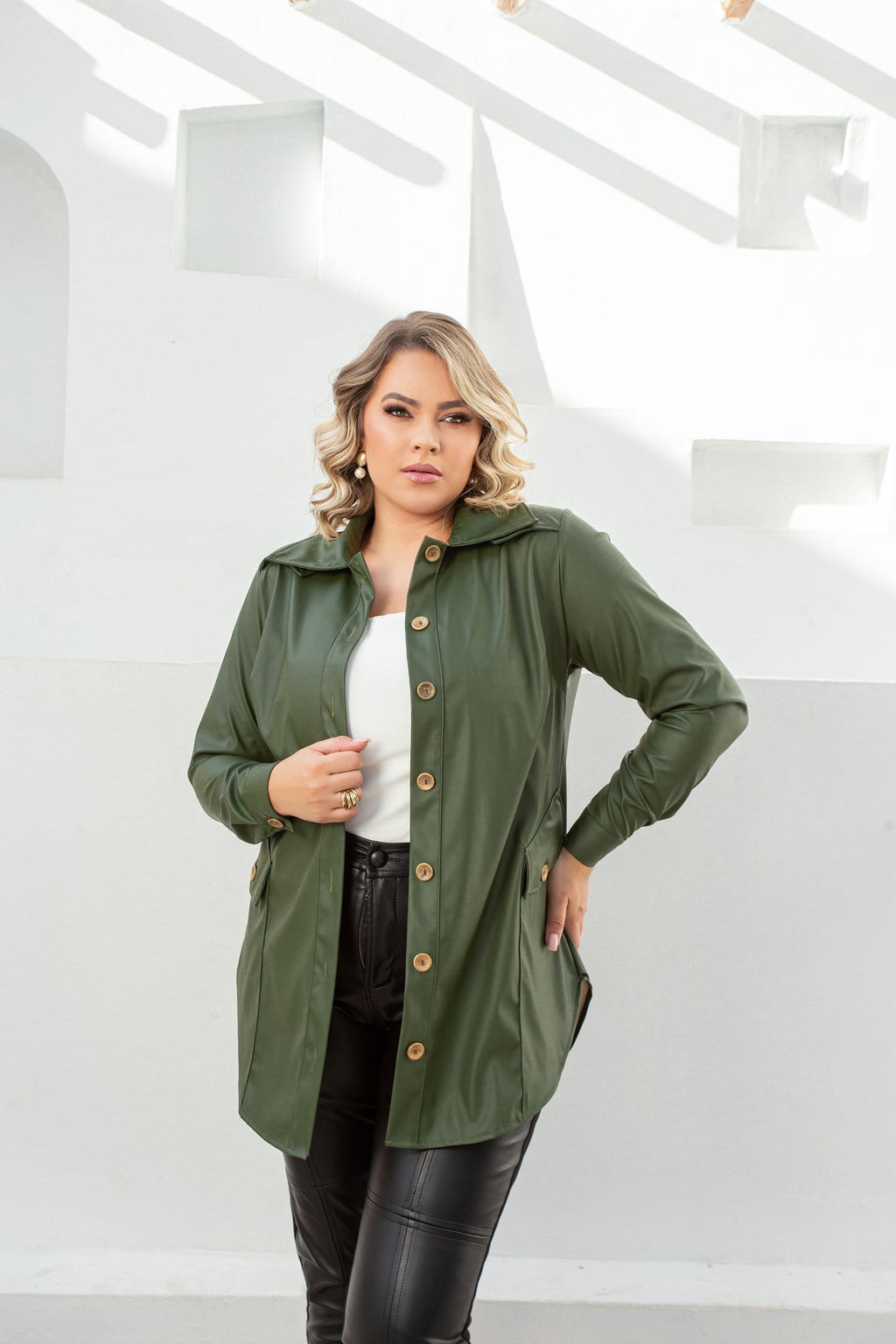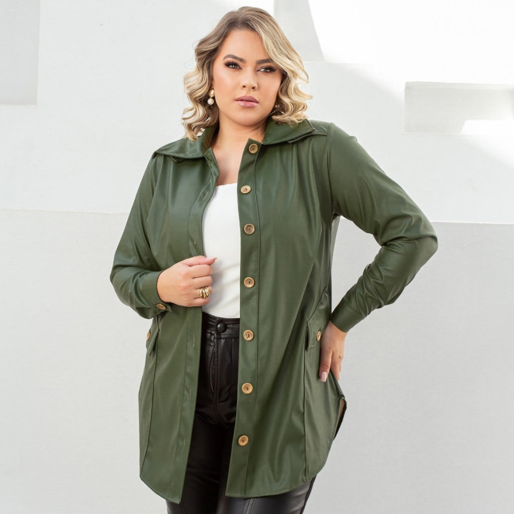 Aposte no verde militar para um look sofisticado e moderno com essa camisa plus size estilo jacket. A peça traz uma modelagem alongada que valoriza a silhueta de forma confortável e elegante, ideal para mulheres que vestem do 44 ao 54. O tecido encorpado com oferece um toque diferenciado, enquanto os botões em ouro velho e os bolsos funcionais completam o visual com charme. Versátil e atual, pode ser usada tanto fechada quanto como sobreposição para produções de outono/inverno.