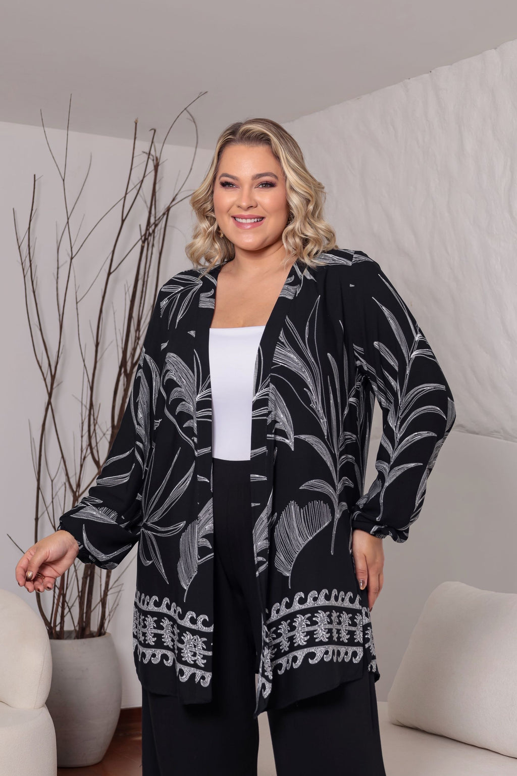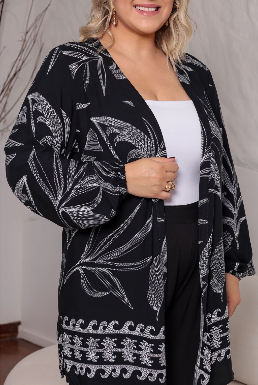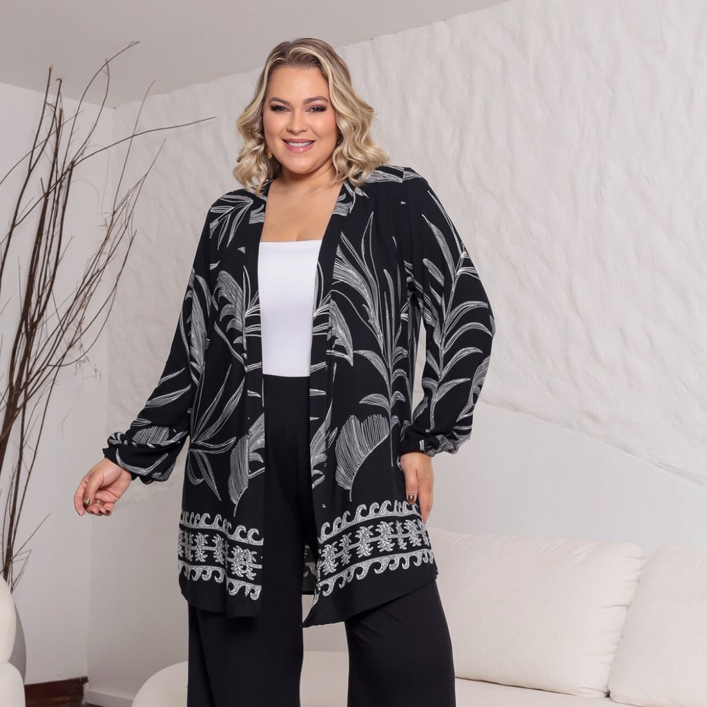 Elegância atemporal e muito estilo: o Kimono Cardigan Estampado Preto Plus Size é aquela peça versátil que transita com facilidade entre o casual e o sofisticado. Sua estampa em preto com detalhes em off-white tem um visual elegante e moderno, perfeita para criar looks impactantes sem perder o conforto.