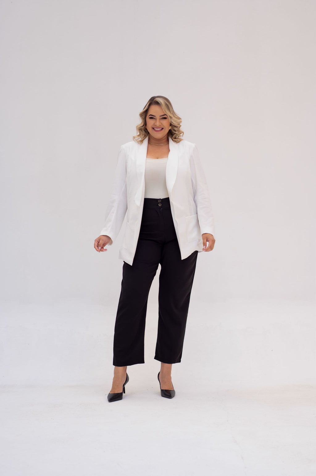 Desenvolvido para vestir do 44 ao 54, este blazer é um verdadeiro coringa no guarda-roupa. A cor off white traz um toque de modernidade e frescor, combinando com produções elegantes para o trabalho, eventos especiais ou até mesmo para looks casuais mais sofisticados. Os bolsos frontais agregam charme e praticidade ao modelo.