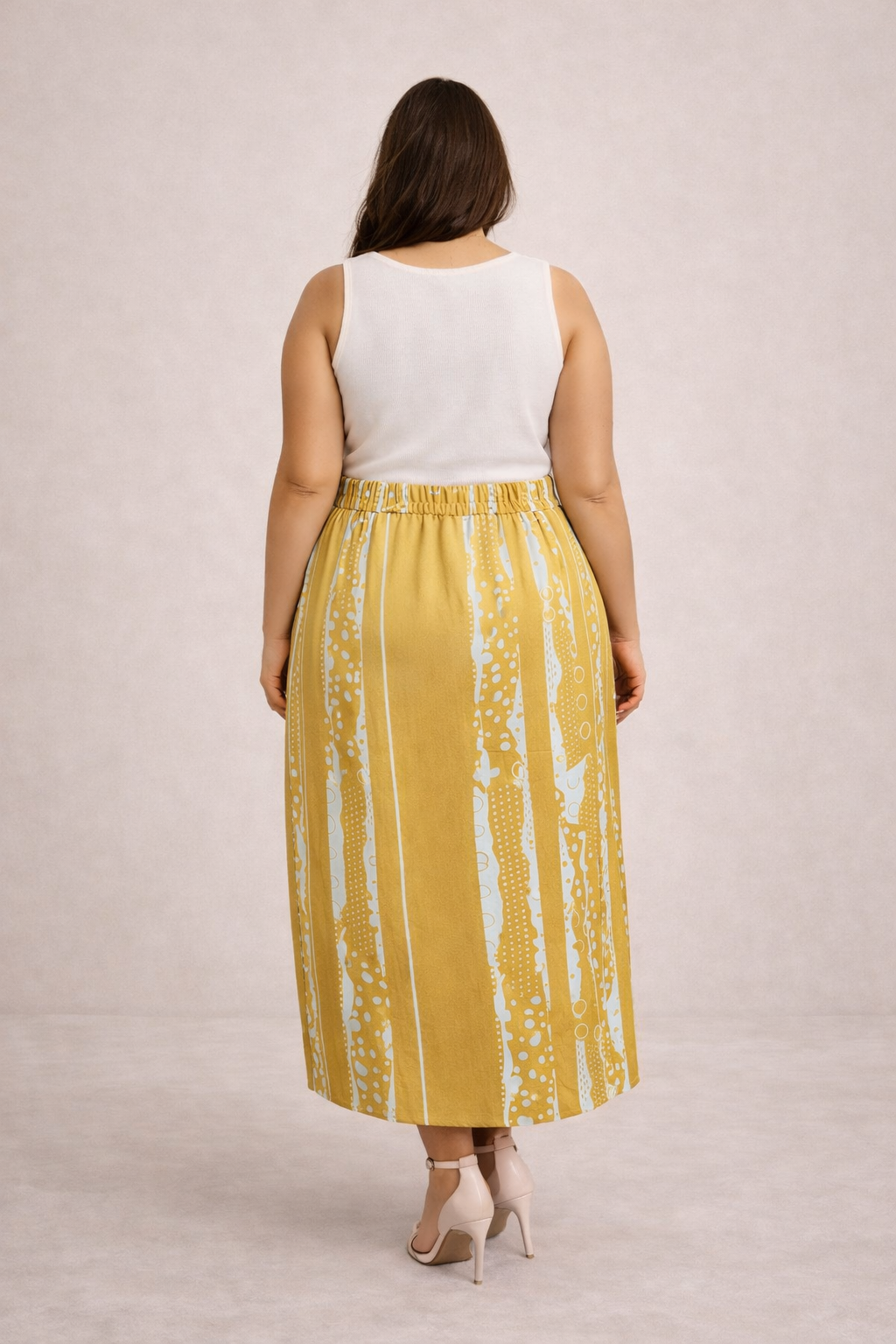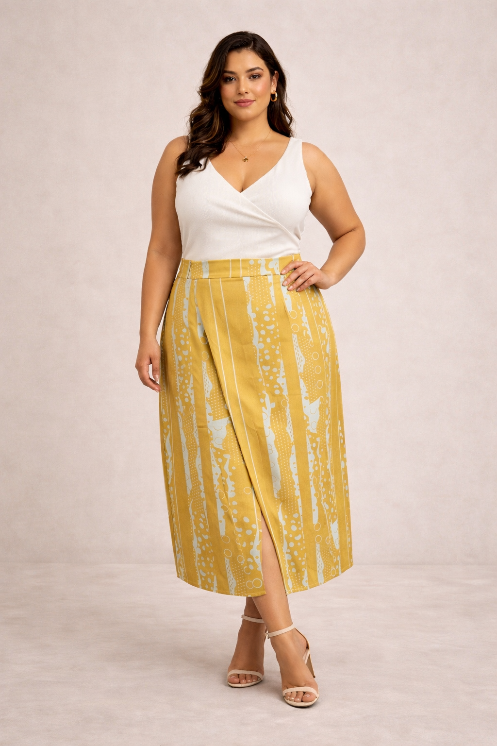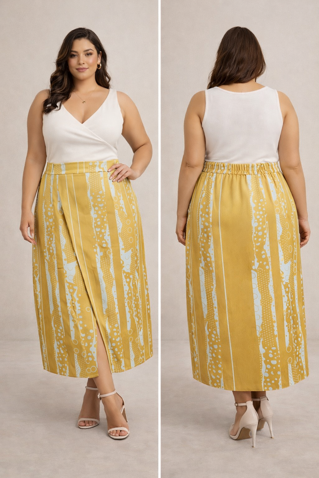 A Saia Midi de Cetim Dourada Plus Size é a definição perfeita de sofisticação com leveza. Com estampa exclusiva em tons dourados, ela traz um toque contemporâneo e elegante, ideal para quem busca uma peça versátil e cheia de personalidade. Sua modelagem reta com fenda frontal garante movimento e fluidez ao caminhar, enquanto o cós com costas elástico nas costas oferece conforto e ajuste perfeito ao corpo.