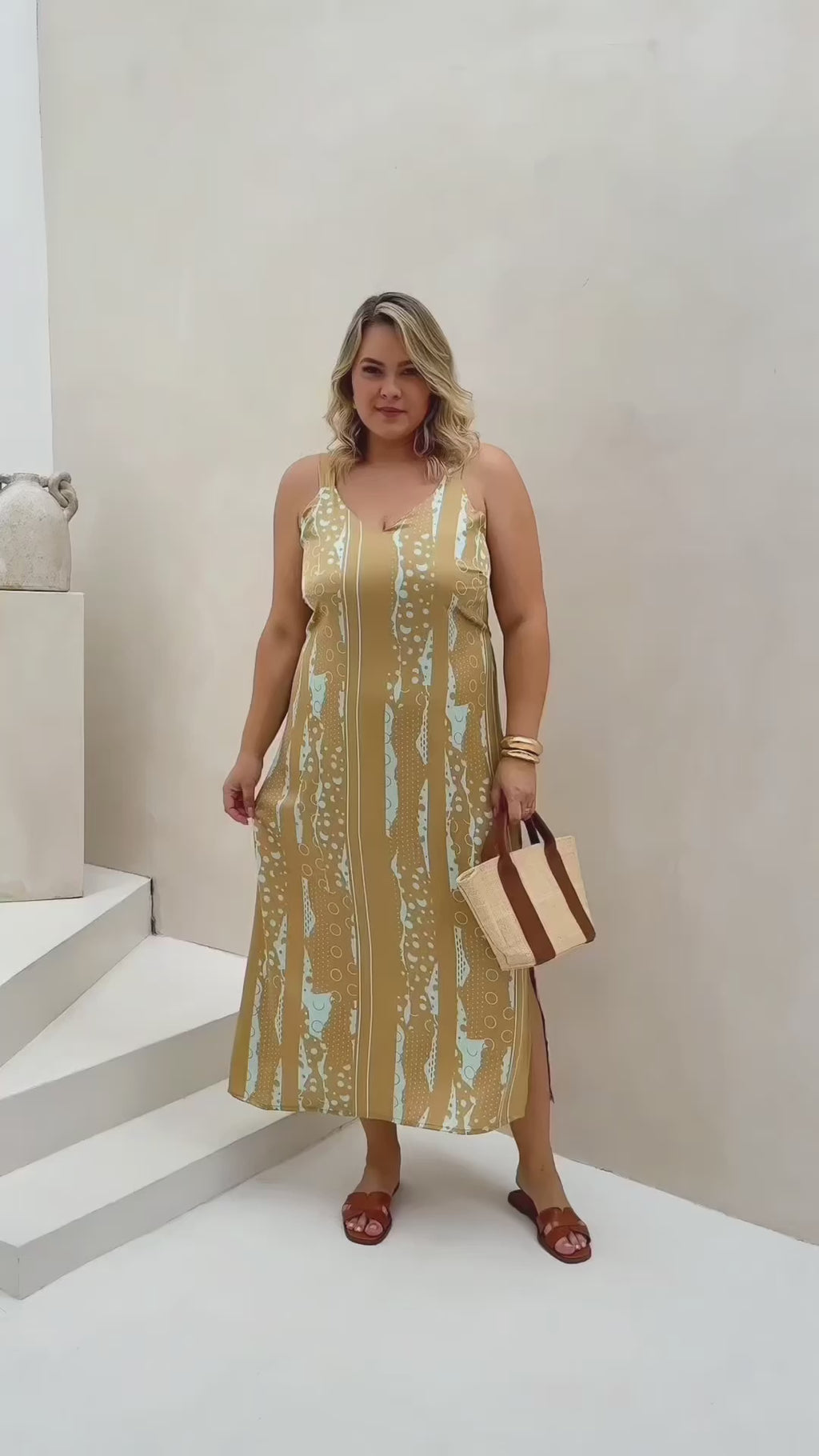 Aposte na elegância minimalista com o vestido longo plus size em caramelo com estampa suave, uma peça leve, confortável e perfeita para composições modernas e naturais. Com alças finas e modelagem levemente evasê, ele veste mulheres do 44 ao 54 com caimento impecável. A estampa geométrica em tons neutros traz sofisticação sem esforço, ideal para quem busca estilo com discrição. Um vestido feminino plus size versátil e atemporal, ideal para os dias de calor ou para looks casuais elegantes.